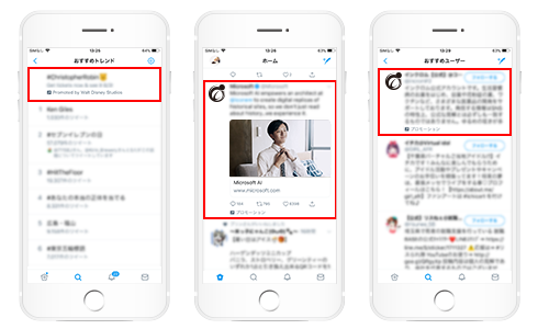 Twitter広告にはプロモアカウントやプロモツイートといった種類があります。プロモツイートでは、ユーザーが最も頻繁に目にするタイムラインや検索結果に表示されます。広告はフォローしている友人の投稿と違和感なく並んで表示されるため、高いエンゲージメント※2が期待できます。
